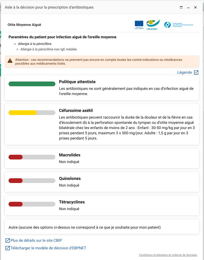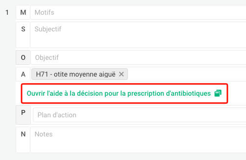 - Cliquez sur le lien "Ouvrir l'aide à la décision pour la prescription d'antibiotiques".
