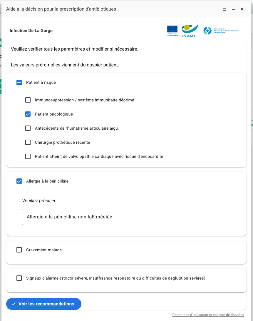 (Certains paramètres peuvent être pré-cochés sur base des éléments de soin et allergies dans le dossier du patient)