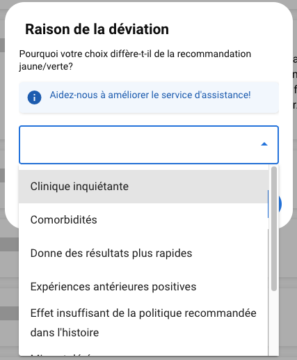 - Si une recommendation "rouge" est sélectionnée, la raison de la déviation doit être sélectionnée dans une liste.