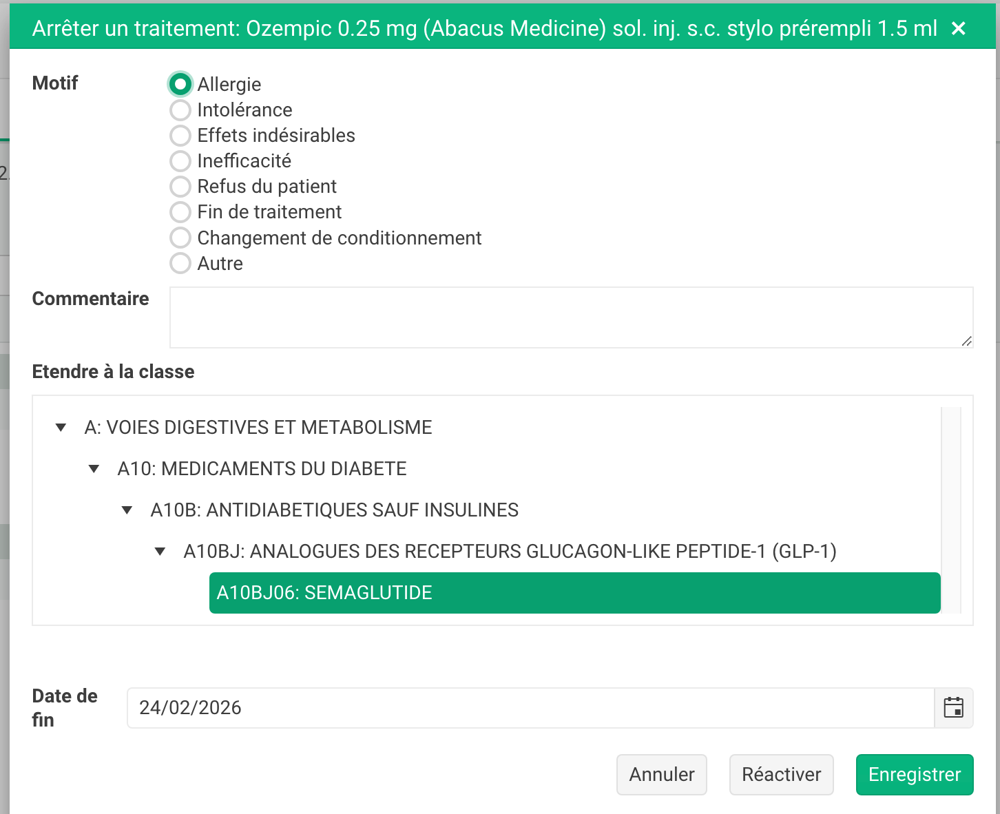 Exemple lors de l'arrêt d'une médication (ajout semaglutide):