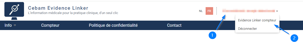 Pour connaitre le nombre de connexions comptabilisées, une fois connecté, cliquez sur votre nom en haut à droite (1) et ensuite sur compteur (2)