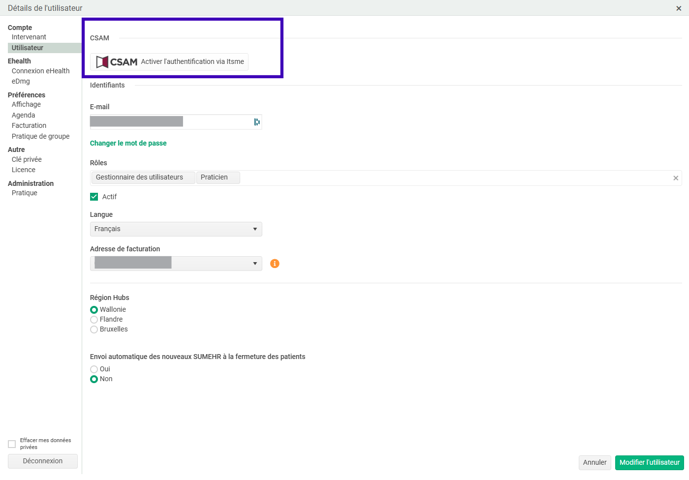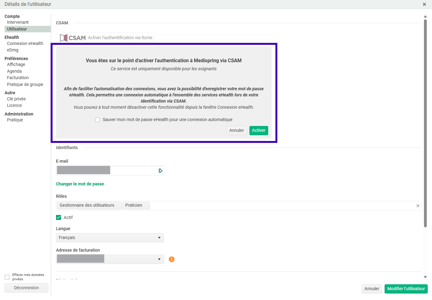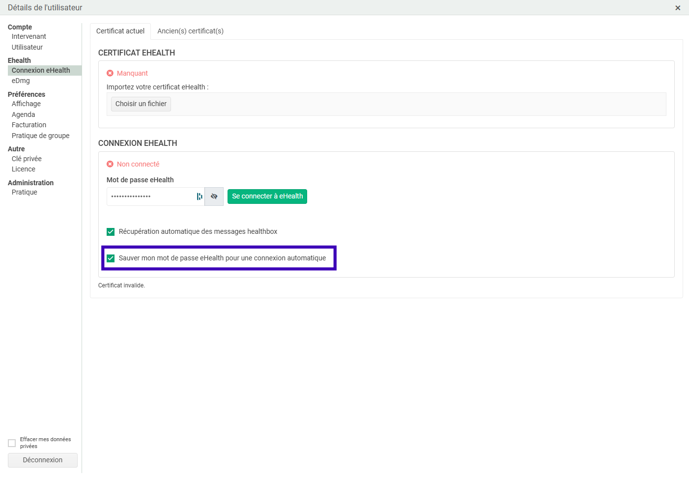 Vous pouvez à tout moment désactiver cette fonctionnalité via la checkbox depuis la fenêtre Connexion eHealth.