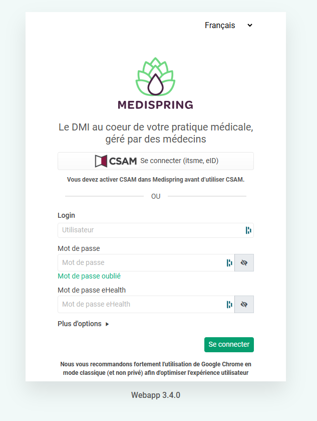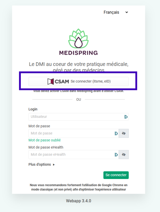 Uniquement disponible en webapp pour le momentLa connexion via CSAM est une nouvelle méthode d’authentification disponible sur Medispring. CSAM est la plateforme fédérale belge qui centralise l’accès sécurisé aux services en ligne. Elle permet notamment de se connecter via itsme, via le lecteur de carte d’identité électronique (eID), ou d’autres moyens d’authentification officiels.