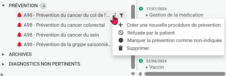 - Enfin, via le menu "contextuel", directement au niveau de la prévention, il est possible d'indiquer que la prévention a été refusée par le patient, est contre-indiqué ou vous pouvez également la supprimer (à la prochaine ouverture du dossier, elle ne sera plus ajoutée automatiquement )