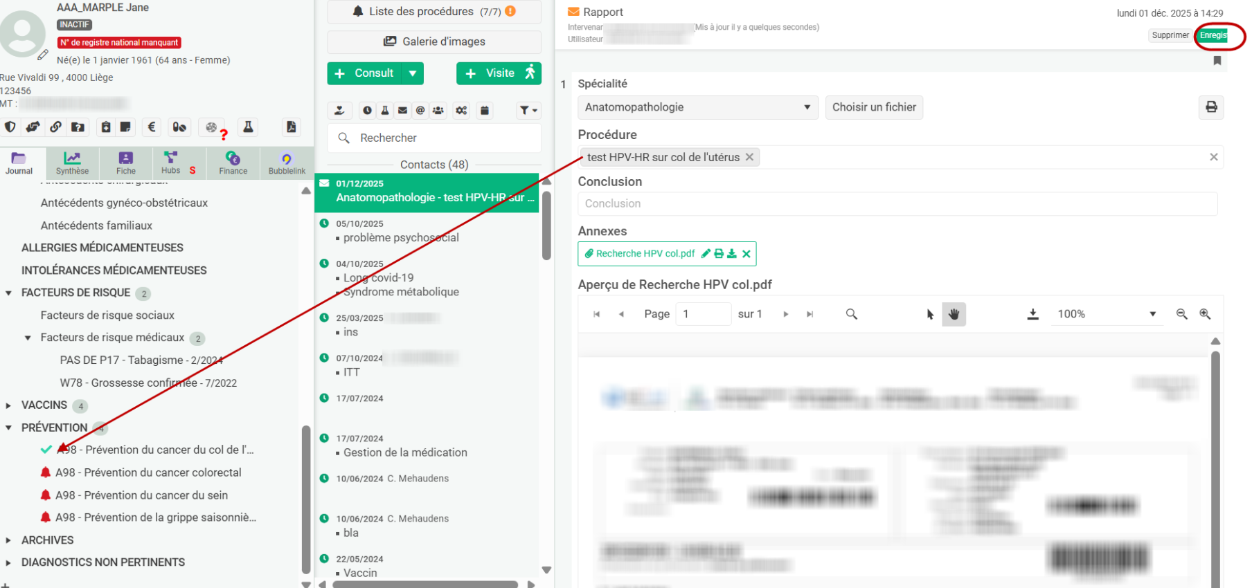 - Dans un contact de type "Rapport": ici aussi la procédure sera directement encodée comme "Effectuée", mettant la prévention à "Faite".