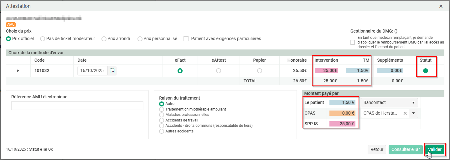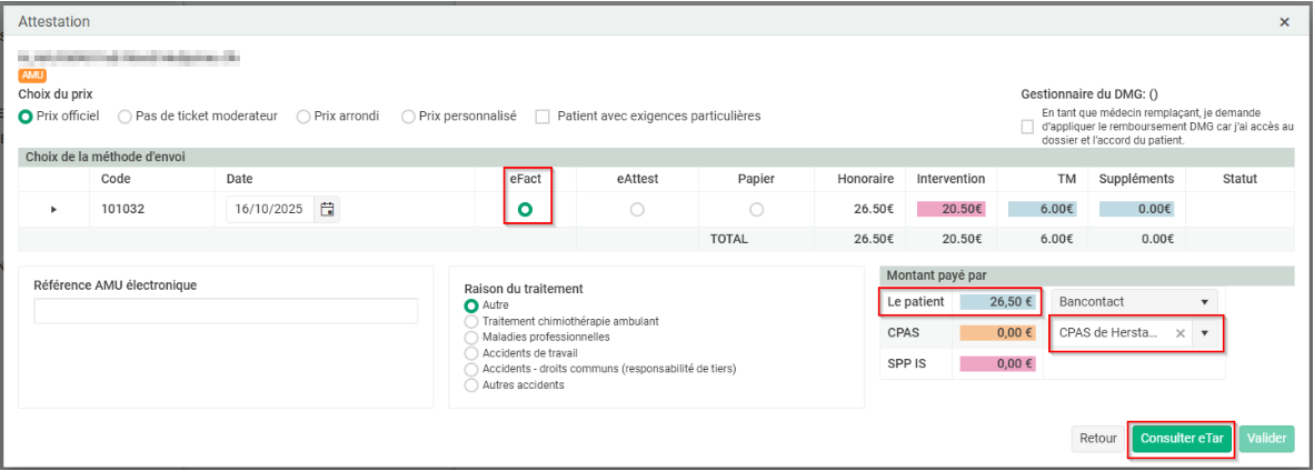 eFact est sélectionné par défaut. eAttest ne peut plus être sélectionné. Papier peut encore être sélectionné au besoin. Tant que vous n'avez pas fait "Consulter eTar", l'Honoraire, l'Intervention et le TM suivant la tarifcation Inami sont affichés et la totalité est indiquée comme à payer par le patient. Le CPAS concerné est indiqué.