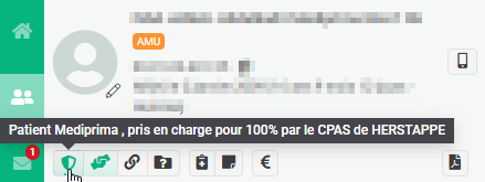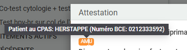 Lorsqu'un patient est pris en charge par un CPAS c'est indiqué par un macaron orange "AMU". En infobulle vous pouvez voir le CPAS.