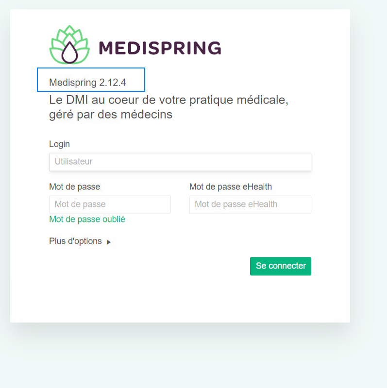Dans ce cas suivez la procédure ci-dessous TOUS LES JOURS et ce jusqu'à ce que votre Medispring se mette à jour et affiche en bas de la page de login - > Desktop version : 3.3.69