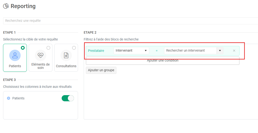 - Par défaut, le reporting se fait maintenant par centre. Le rôle "coordination des patients" permet de faire apparaitre une checkbox qui permettra à l'utilisateur de faire des recherches sur tous les centres.