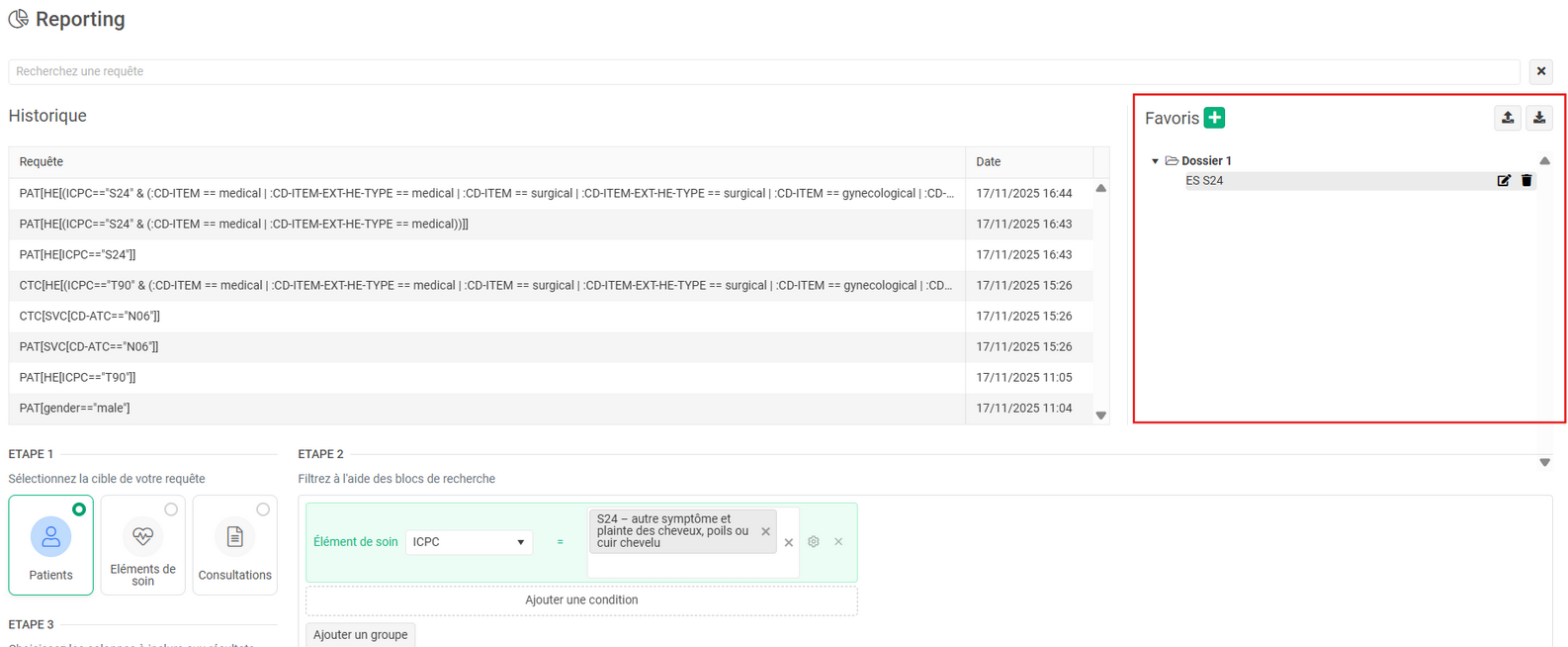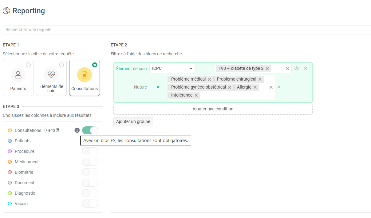 - Lorsqu’une requête est effectuée avec la cible consultations à l'étape 1 et qu’une recherche est réalisée à l’étape 2 sur un ES, la sélection des consultations à l’étape 3 devient obligatoire pour pouvoir récupérer les résultats.