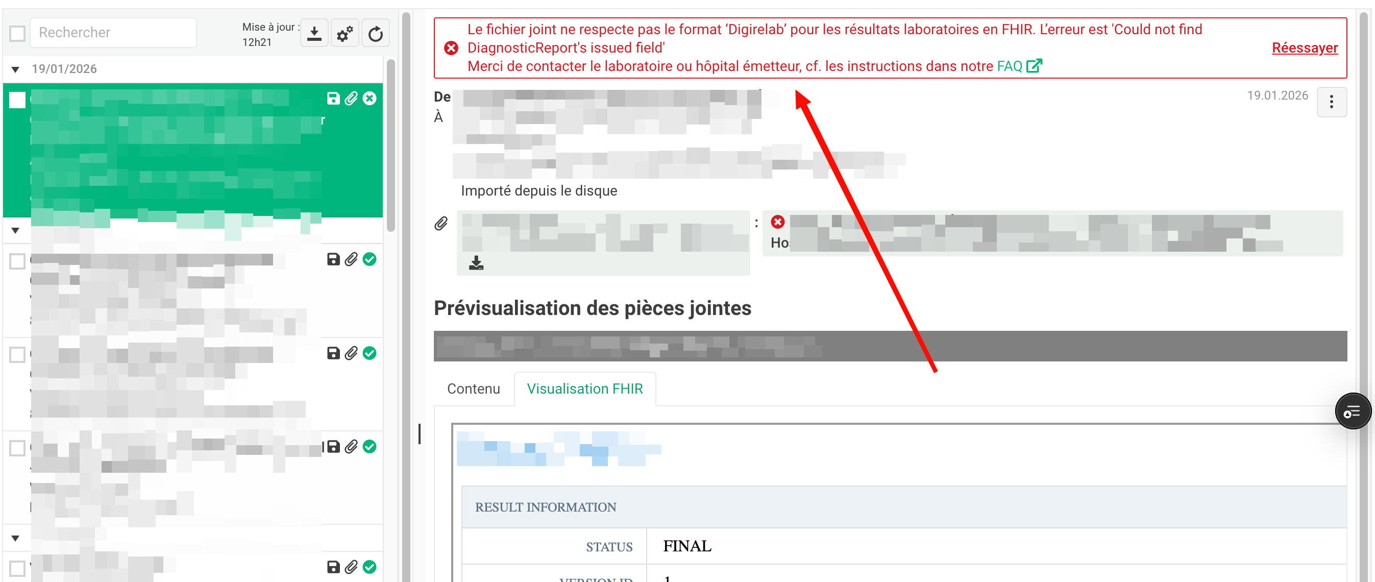 A partir de la version 3.8 Medispring affichera un message d'erreur si le fichier ne semble pas conforme au nouveau format "Digirelab" (FHIR) attendu par Medispring, afin une première indication en anglais d'où se trouve l'erreur (dans l'exemple ci-dessous: "Could not find DiagnosticsReport's issued field".
