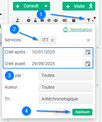 Filtrer les contacts (date, spécialité, contact, laboratoire, rapport, téléconsultation, ...)