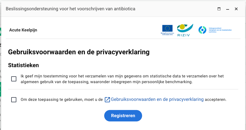 - Als u nog geen toestemming hebt gegeven voor het gebruik van de beslissingsondersteuning, moet u dit eerst doen door het tweede vakje aan te vinken.(Het eerste vakje heeft betrekking heeft op uw toestemming voor het verzamelen van gegevens voor statistische doeleinden en is optioneel)
