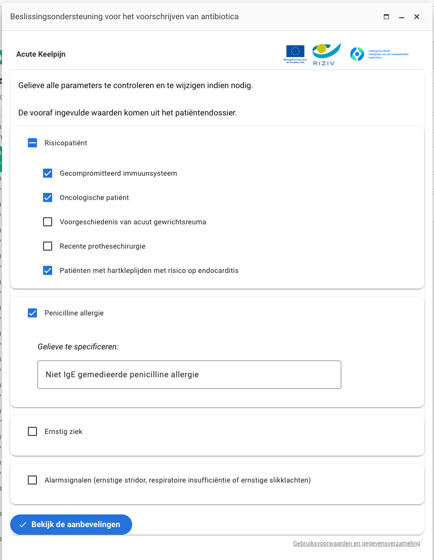 - Vul aanvullende parameters in (die variëren naargelang de diagnose) en klik op “bekijk de aanbevelingen”.(Sommige parameters kunnen vooraf zijn aangevinkt op basis van de gezondheidselementen en allergieën in het patiëntendossier)
