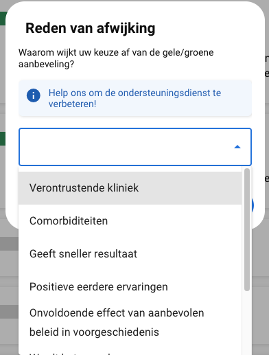 - Als een “rode” aanbeveling wordt geselecteerd, moet de reden voor de afwijking uit een lijst worden gekozen.