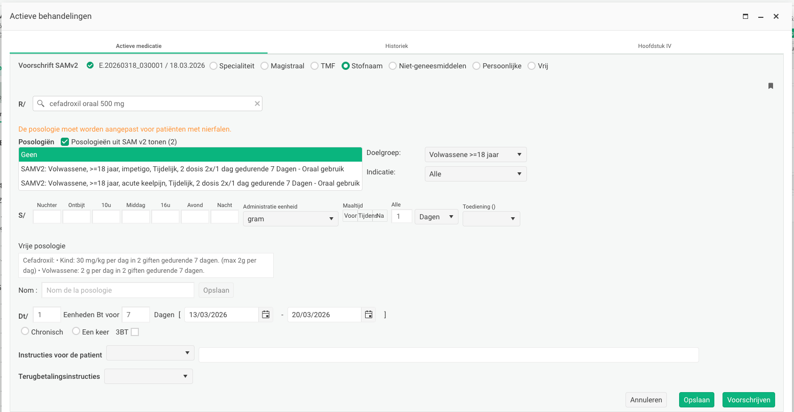 - Voor bepaalde aanbevelingen wordt een voorschrift op stofnaam aangemaakt en vooraf ingevuld:(In dit stadium is de posologie in vrije tekst, maar niets belet u deze te bewerken of om te zetten in een gestructureerde posologie)
