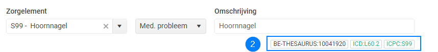 Zodra het gezondheidselement is geselecteerd, zullen de codes die aan dit gezondheidselement zijn gekoppeld worden weergegeven (2) en de link "Evidence Linker" zal dan functioneel zijn.
