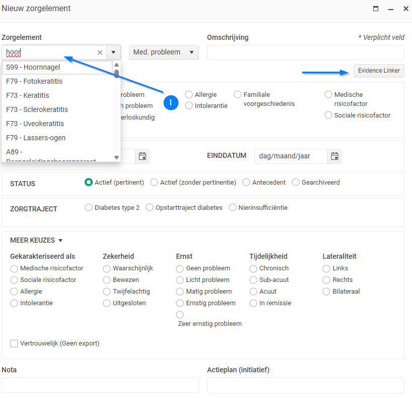 Als je een gezondheidselement alleen als vrije tekst hebt gecodeerd in het veld "Beschrijving", dan zal de link "Evidence Linker" niet actief zijn.