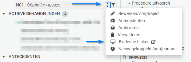 Als je relevante informatie uit Evidence Based Medicine wilt opvragen, klik dan op het menu van een gezondheidselement en kies "Evidence Linker".