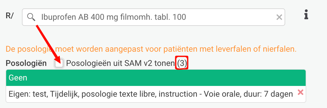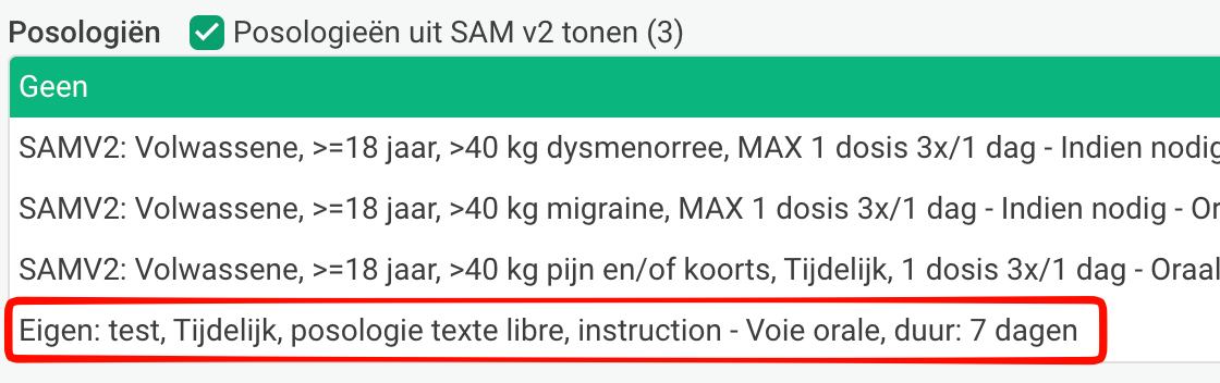 - U kunt ervoor kiezen om deze posologieën niet meer weer te geven door het vakje “Posologieën uit Sam v2 tonen” uit te vinken.
