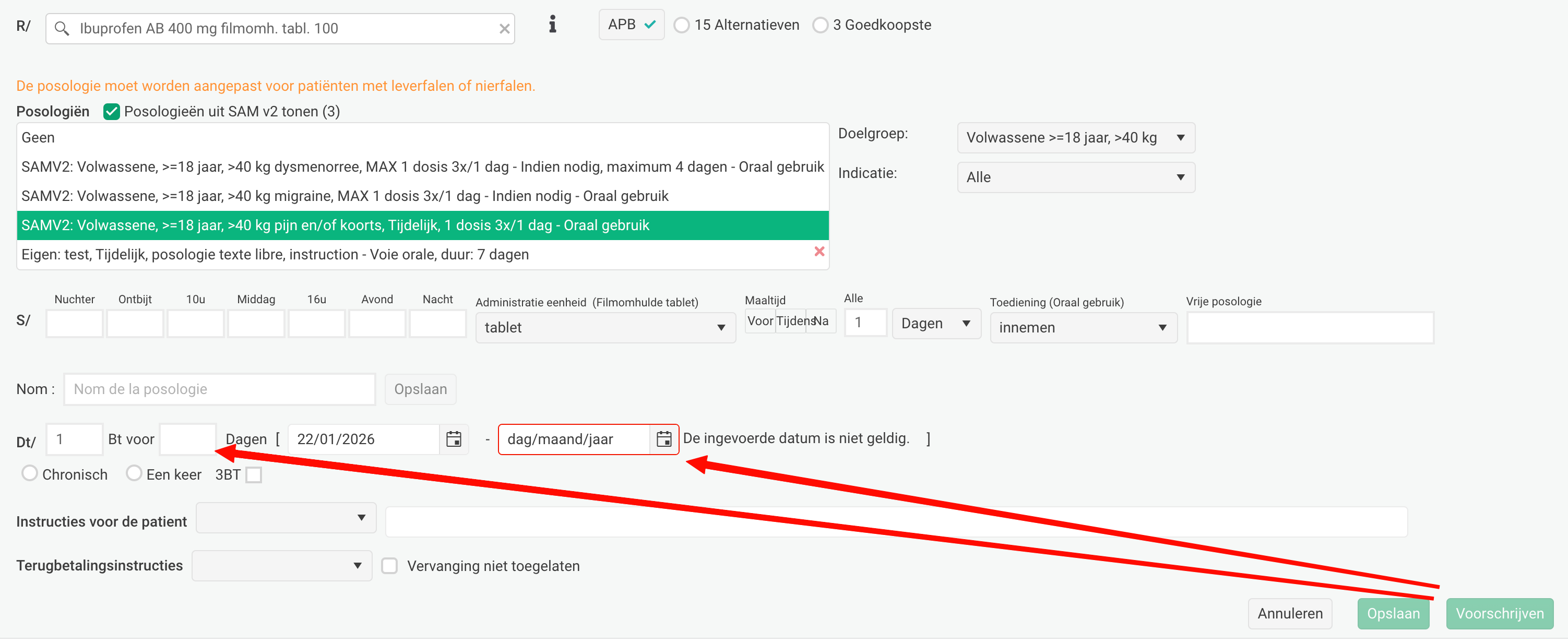 - Voor bepaalde gebruikelijke posologieën mogen we de duur en einddatum niet berekenen (ifv van de inhoud van de verpakking en de gestructureerde posologie), noch deze standaard op 7 dagen instellen! U moet dus de einddatum of de duur invoeren om de knop “Voorschrijven” te activeren.