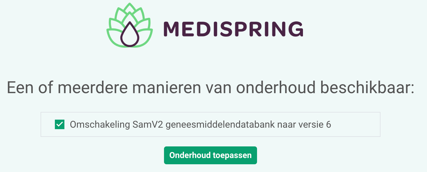 - Met versie 3.8 moet bij de eerste login een kort onderhoud worden uitgevoerd om versie 6 van de geneesmiddelendatabase “Sam v2” te activeren.