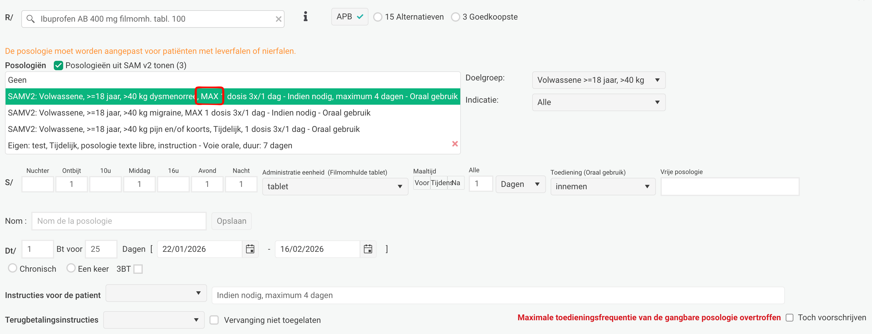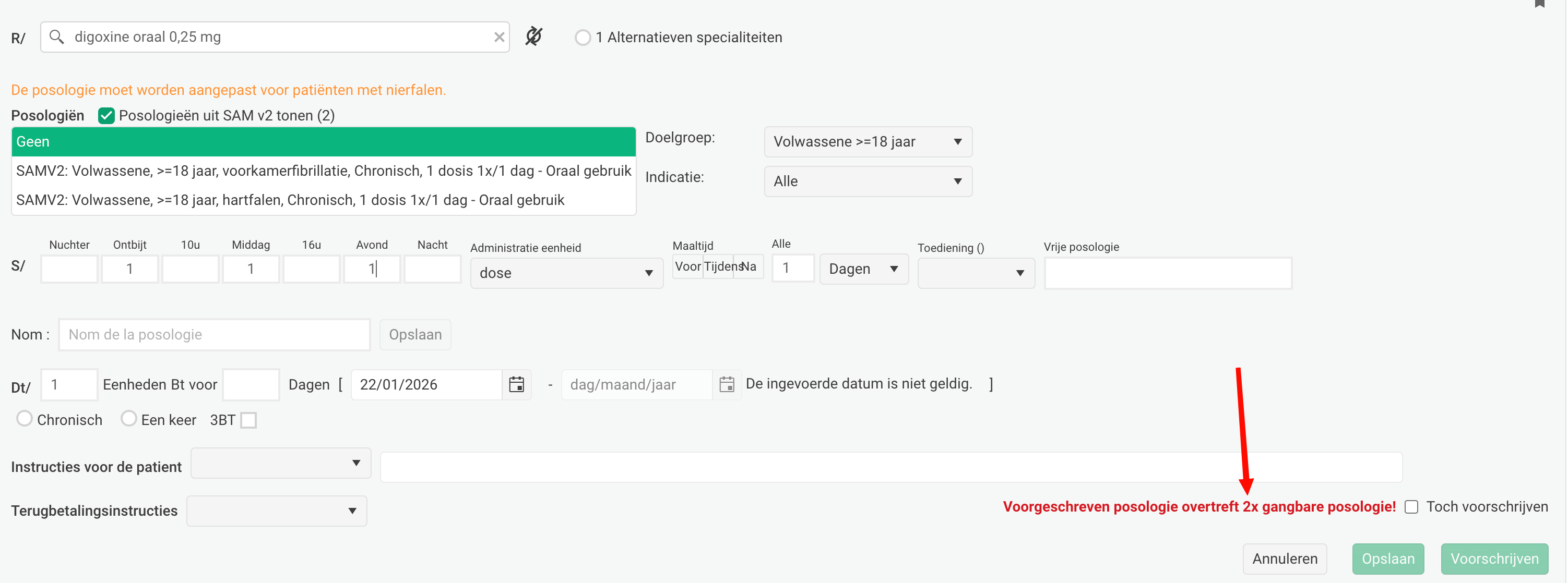 - Door “Toch voorschrijven” aan te vinken, kan het toch voorgeschreven worden zonder de posologie aan te passen.