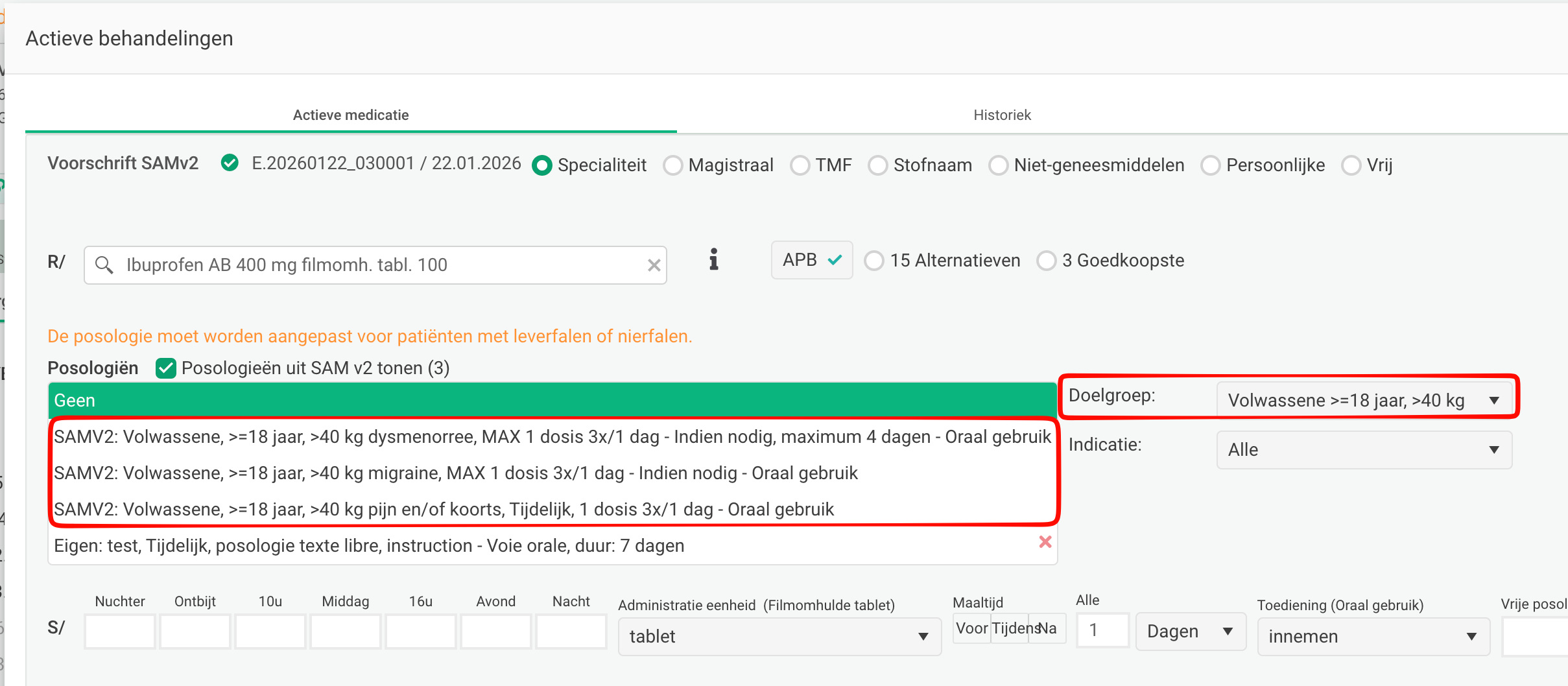 - Zodra u v6 van de medicatiedatabase hebt geactiveerd (zie instructies hierboven), verschijnen de gebruikelijke posologieën wanneer u een medicijn (specialiteit of DCI) hebt geselecteerd. De gebruikelijke posologieën zijn afkomstig van de overheid en worden voorafgegaan door “SAMV2:”. Ze verschijnen altijd bovenaan de lijst (homologatiecriterium).