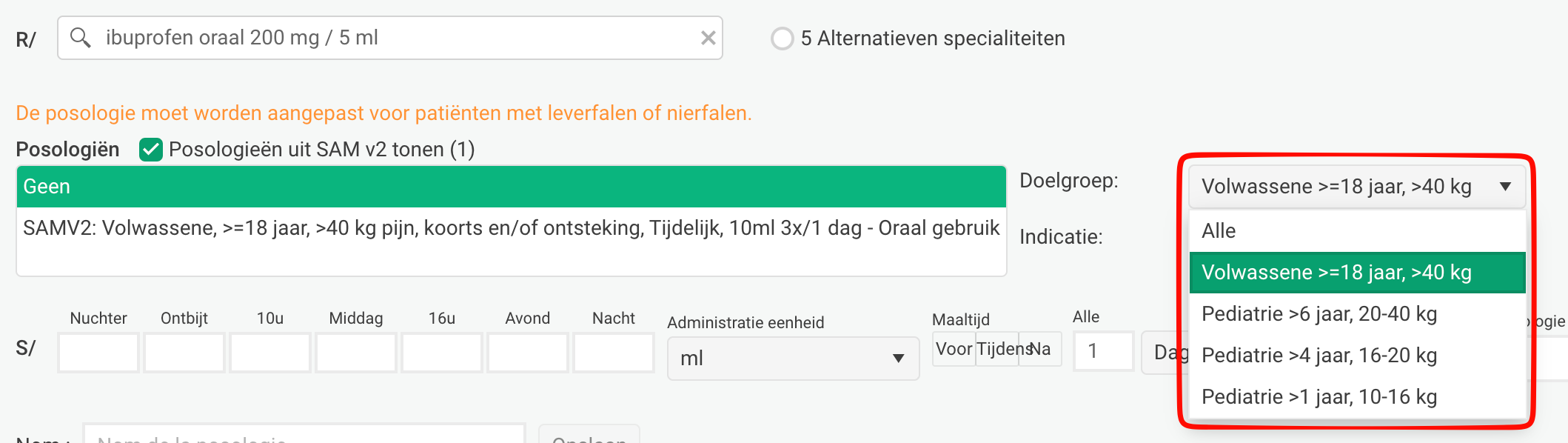 - Rechts kunt u de SAMV2-posologieën filteren op ‘doelgroep’ (leeftijd en gewicht) en/of “indicatie”.