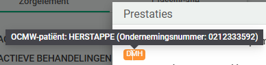 Wanneer een patiënt door een OCMW wordt gedekt, wordt dit aangegeven met een oranje badge “DMH”. In de tooltip kunt u het OCMW zien.