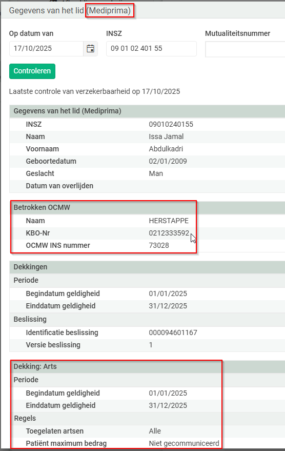 De volgorde voor het controleren van de verzekerbaarheid is: 1) Mutualiteit 2) Mediprima 3) RCAM.