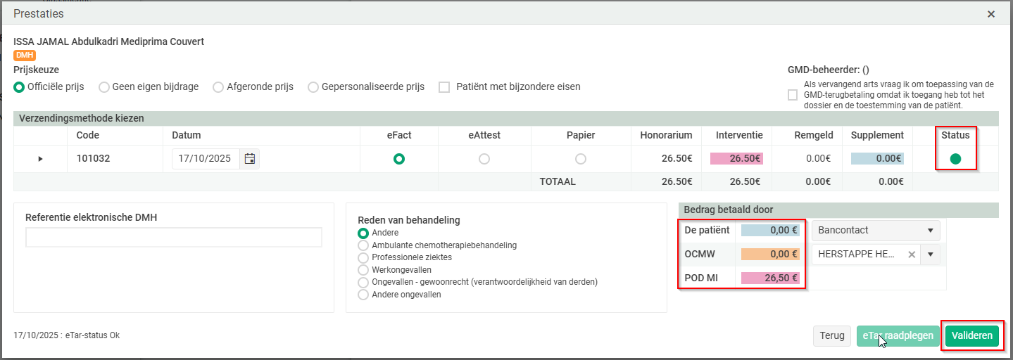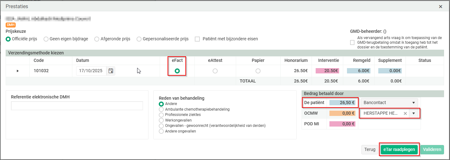 eFact is standaard geselecteerd. eAttest kan niet meer worden geselecteerd. Papier kan indien nodig nog steeds worden geselecteerd. Zolang u niet op ‘eTar raadplegen’ hebt geklikt, worden het honorarium, de tussenkomst en het TM volgens de RIZIV-tariefregeling weergegeven en wordt het totale bedrag aangegeven als te betalen door de patiënt. Het betreffende OCMW wordt vermeld.