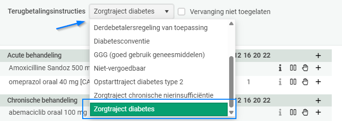 U moet "Zorgtraject diabetes" selecteren in het gedeelte "Terugbetalingsinstructies".