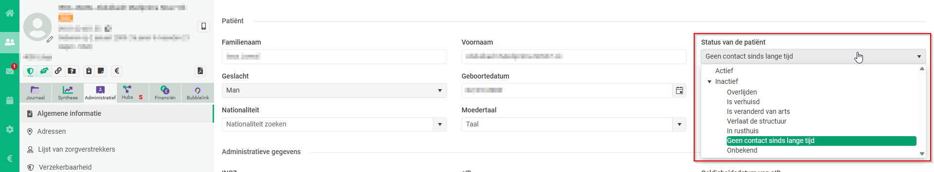 - In de administratieve fiche werd het vakje ‘Actief’ vervangen door een keuze lijst "Status van de patiënt", waarin meteen ook de reden van de status "Inactief" kan worden aangegeven/