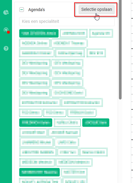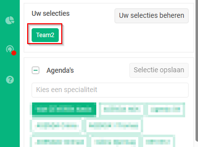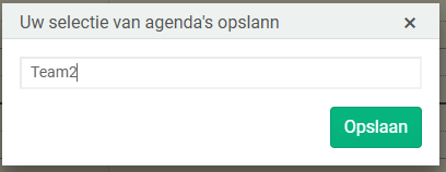 Een selectie is een groep van geselecteerde agenda's die kan worden opgeslagen en een naam kan krijgen. (bijvoorbeeld: Team A, Dagteam, Maandag, Dinsdag, enz.)