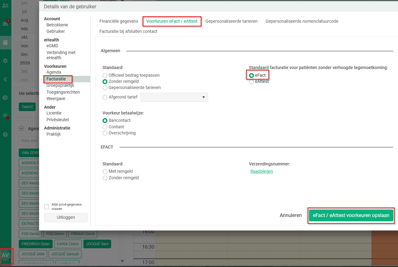 - Wijkgezondheidscentra in forfait: in het kader van de verplichte elektronische facturatie: technische prestaties voor patiënten in forfait en prestaties voor patiënten in wachttijd, staan niet langer standaard op "Stat". Nu worden standaard de facturatie-voorkeuren toegepast (Profiel > Facturatie > Voorkeuren eFact/eAttest). Zorg ervoor dat u deze op eFact configureert (belangrijk: de artsen moeten deze prestaties zelf ingeven, en de facturaties zelf regelmatig opsturen en opvolgen, met hun eigen eHealthsessie).