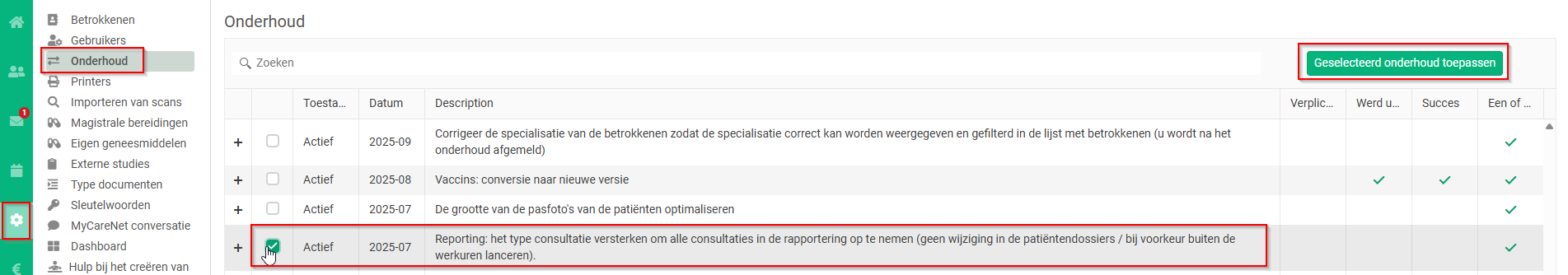 - Nieuw Onderhoud “Reporting: het type consultatie versterken om alle consultaties in de rapportering op te nemen (geen wijziging in de patiëntendossiers / bij voorkeur buiten de werkuren lanceren)”. Eenmalig uit te voeren per praktijk om contacten zonder type met terugwerkende kracht naar “Raadpleging” aan te passen, zodat ze correct in de rapportage verschijnen bij het filteren op contacttype.