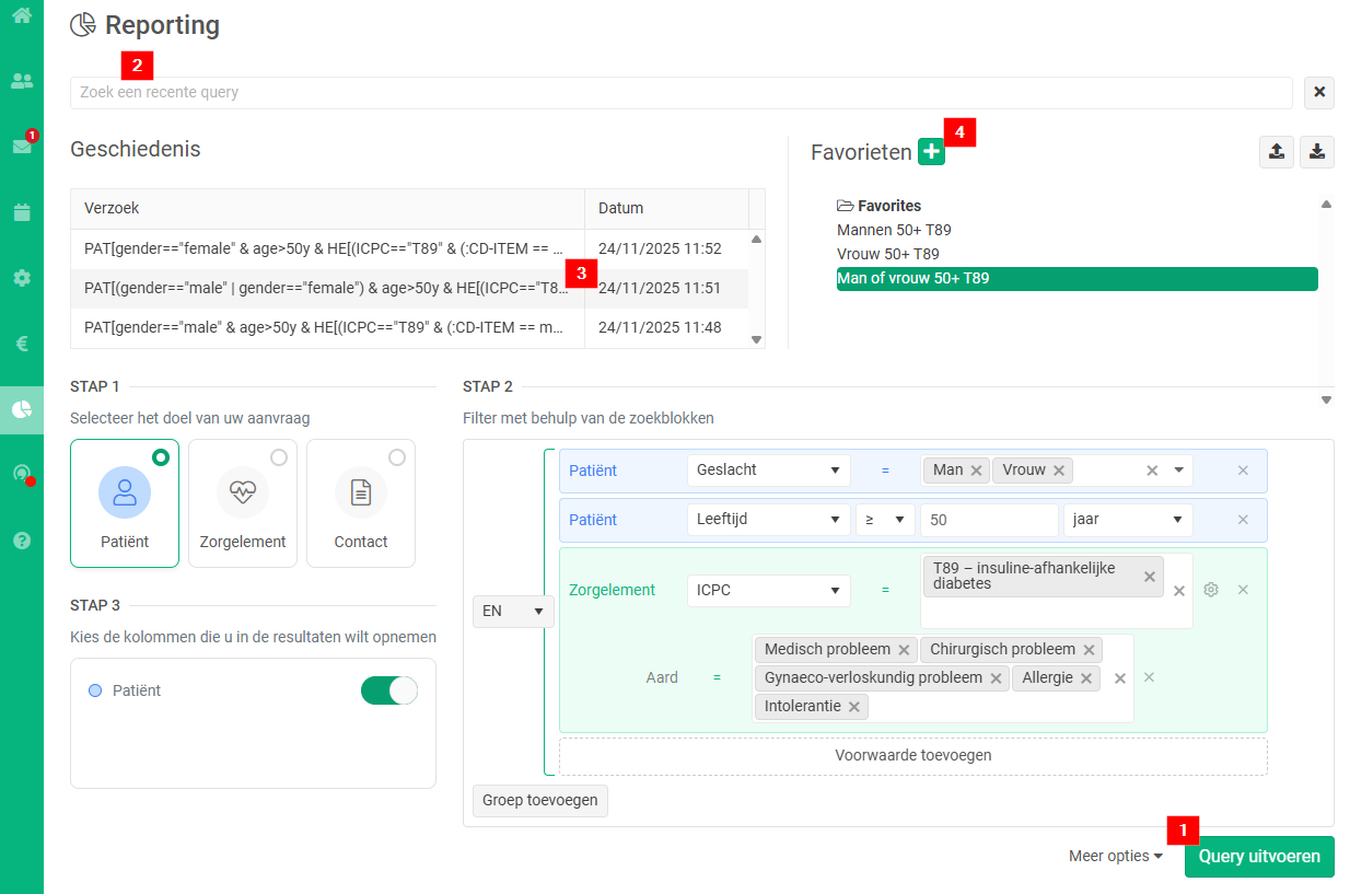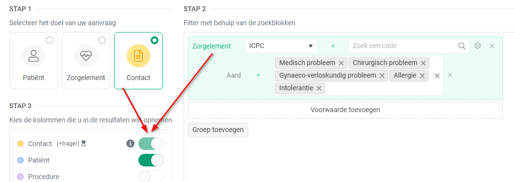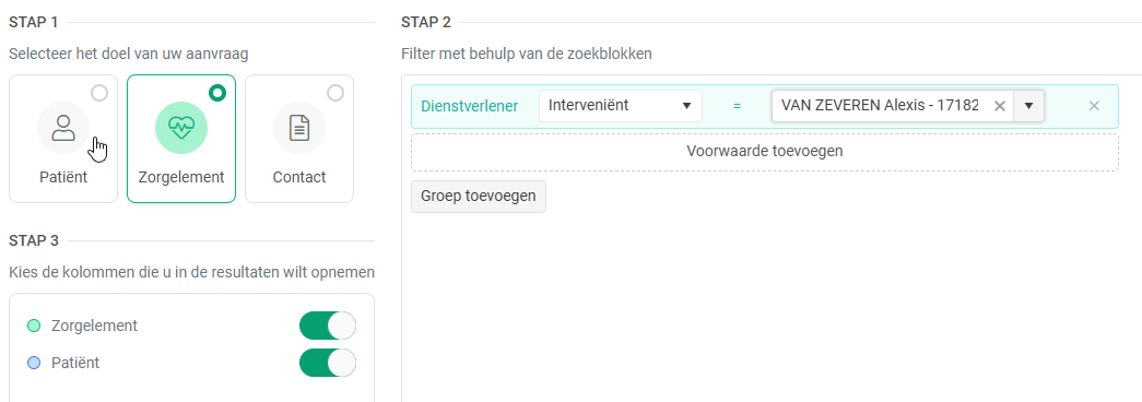 - Wanneer een verzoek wordt gedaan met als doel "Contact" in stap 1 en er in stap 2 een filtervoorwaarde wordt bepaald op een "Zorgelement", dan is de selectie van "Consultaties" in stap 3 automatisch en verplicht (waardoor de zoekopdracht langer duurt).