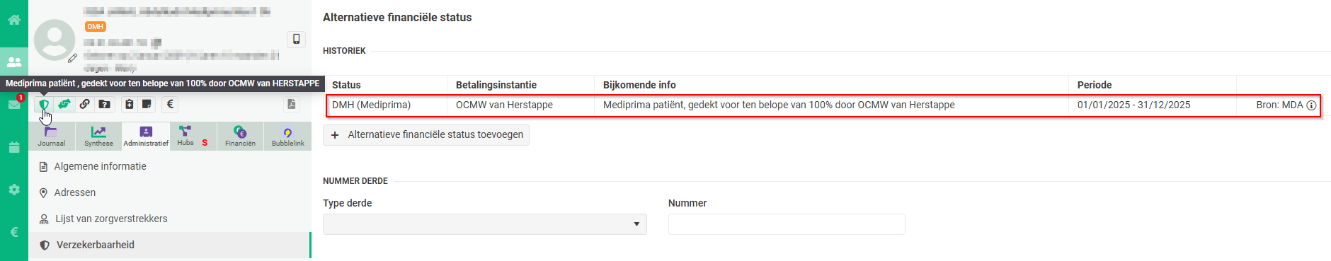 - In het patiëntendossier, onder “Verzekerbaarheid”, verschijnt de status ‘DMH’ nu onder “Alternatieve financiële status” (en niet meer onder “Historiek Verzekerbaarheid”).