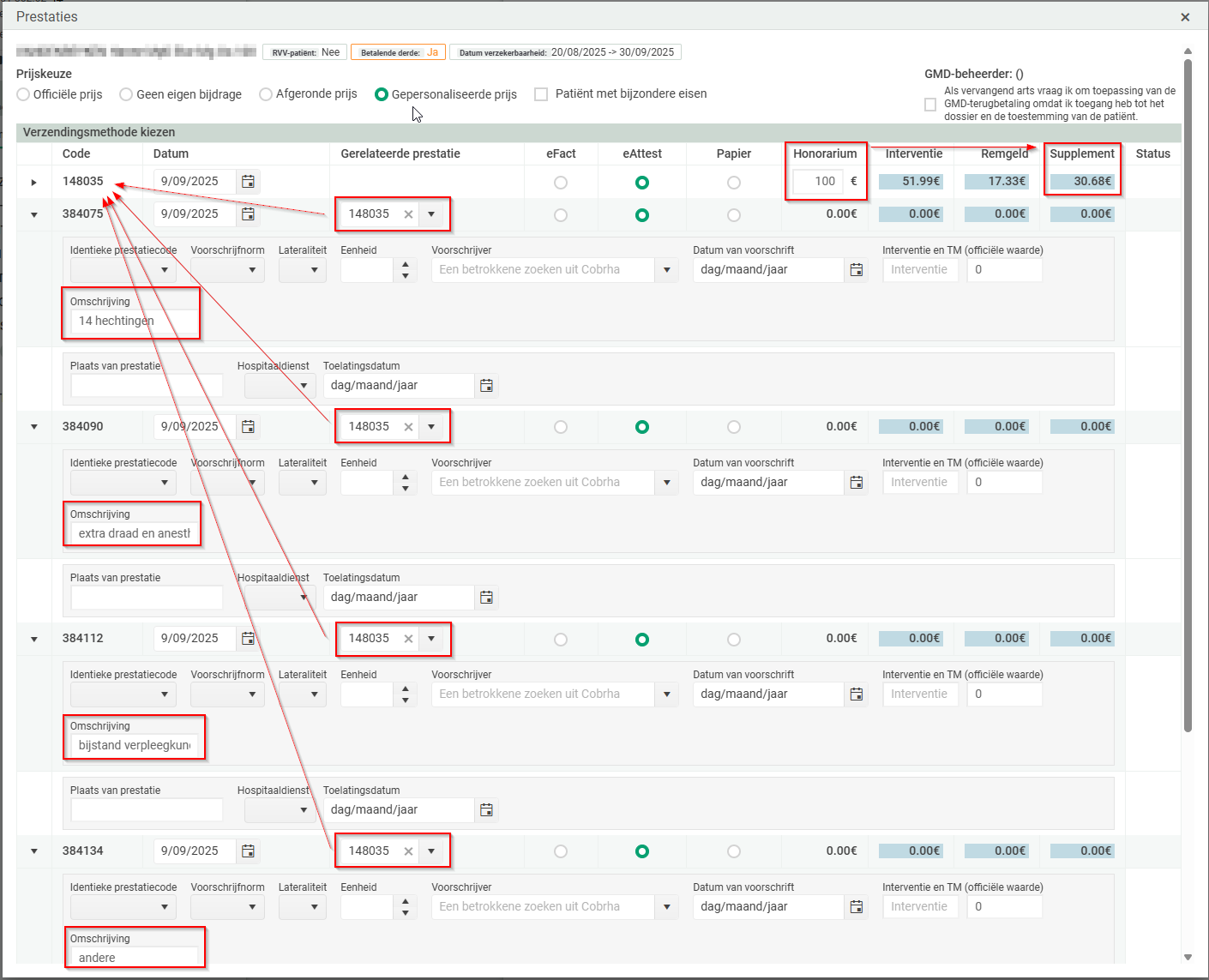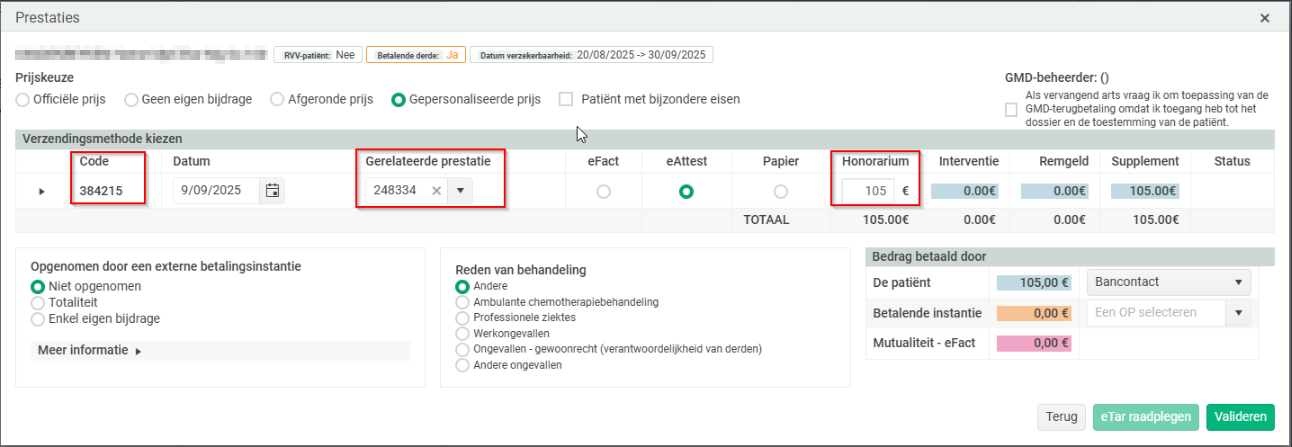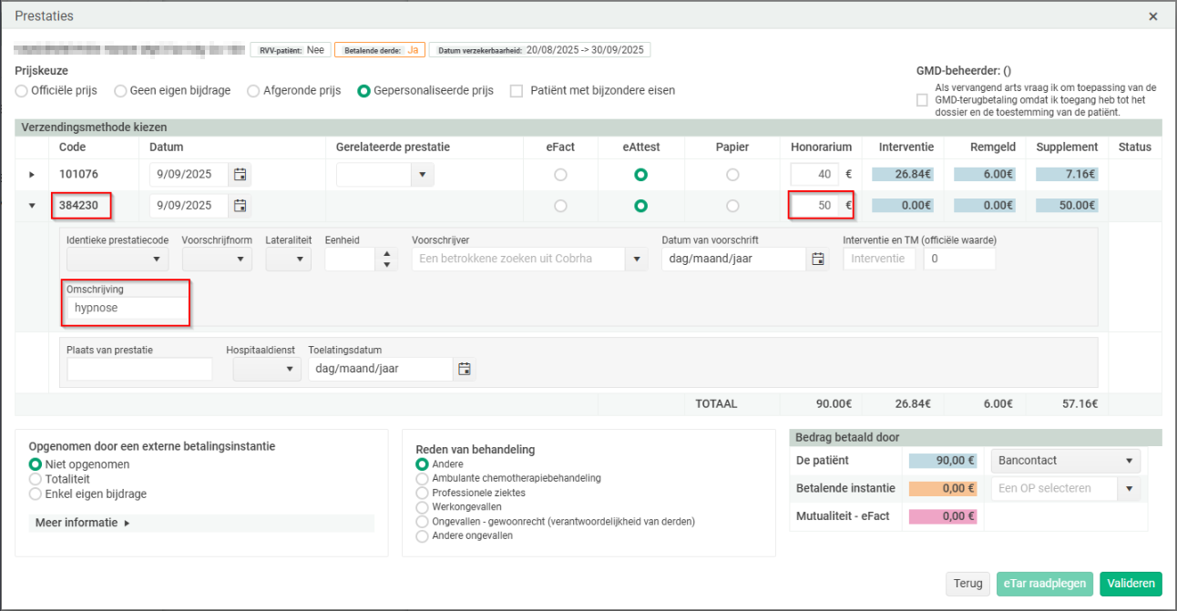 - 384230 (cat3) - er bestaat geen code in de nomenclatuur van het RIZIV. Alleen te gebruiken voor medische zorg, dus niet voor “administratieve” kosten (bijvoorbeeld “schadevergoeding” voor een gemiste afspraak). Geen gerelateerde prestatie, maar de omschrijving en het bedrag van het honorarium moeten worden ingevuld.