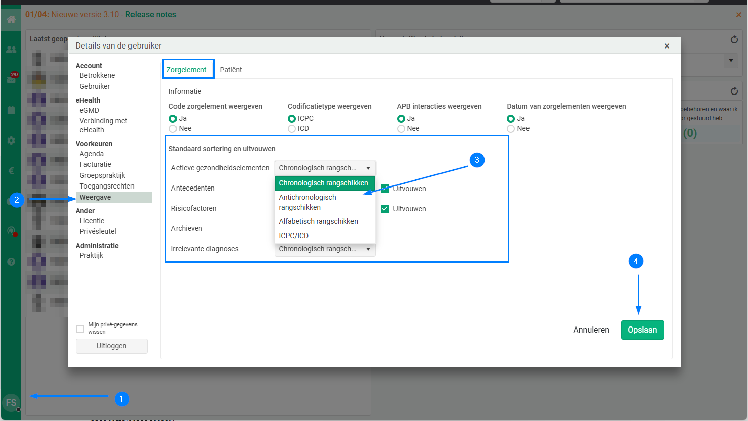 - Vink DE CODE VAN DE ZORGELEMENT WEERGEVEN (4) aan en kies het gewenste coderingssysteem (ICPC of ICD)