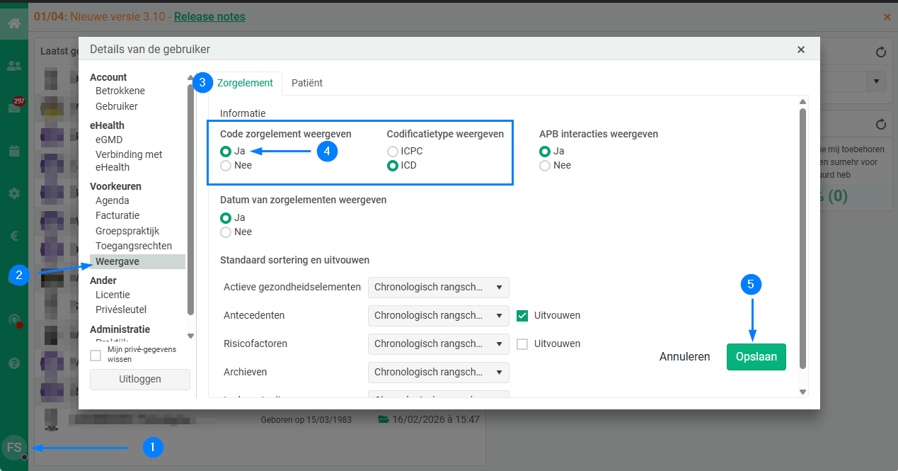 - Klik op OPSLAAN (5) (om de weergave te vernieuwen, moet u de reeds geopende patiëntendossiers sluiten en opnieuw openen)