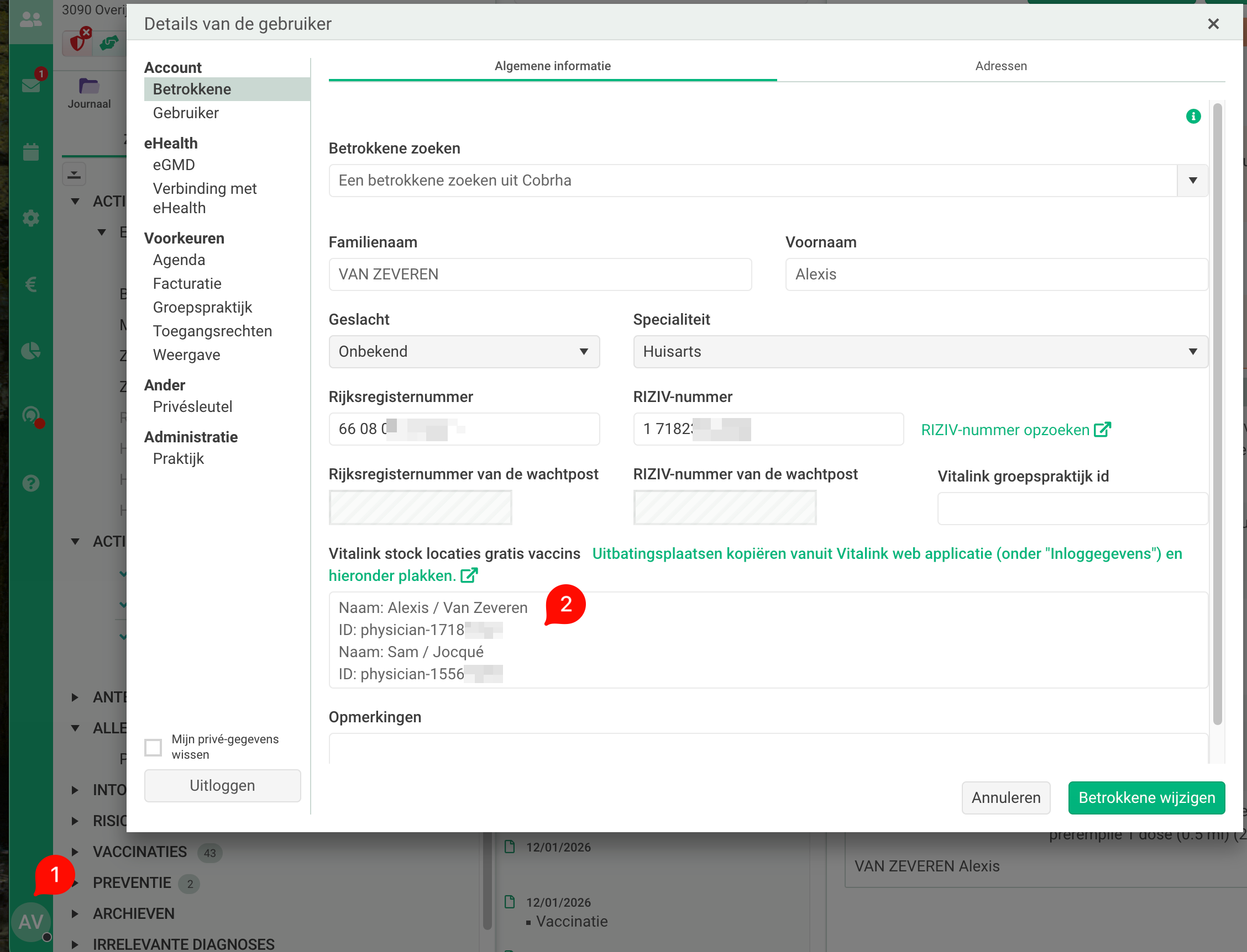 - In Medispring, open uw profiel/Details van gebruiker en kopieer de inhoud van het klembord in het veld "Vitalink stock locaties gratis vaccins"