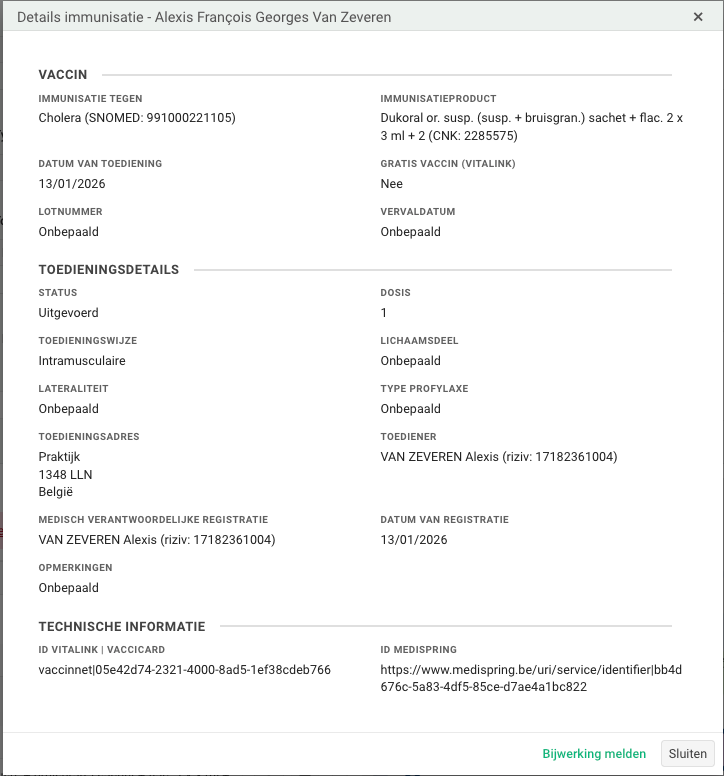 - Vrije tekst vaccins komen onder "Andere vaccins" (bv. indien "A-RIX-TETRA" wordt ingegeven i.p.v. ""α-RIX-Tetra" te selecteren uit de lijst)