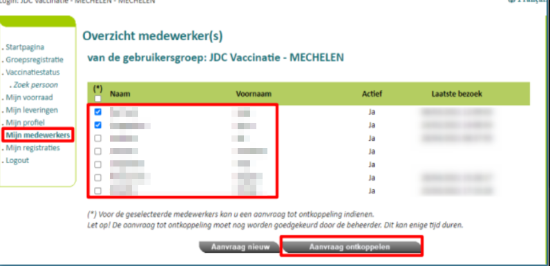 c. Selecteer de verpleegkundige(n) en kies voor ‘Aanvraag ontkoppelen’