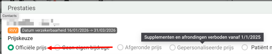 - De "Officiële" prijs wordt automatisch geselecteerd (zelfs indien in de eFact/eAttest voorkeuren "Gepersonaliseerde tarieven" of "Afgerond tarief" werd geselecteerd).