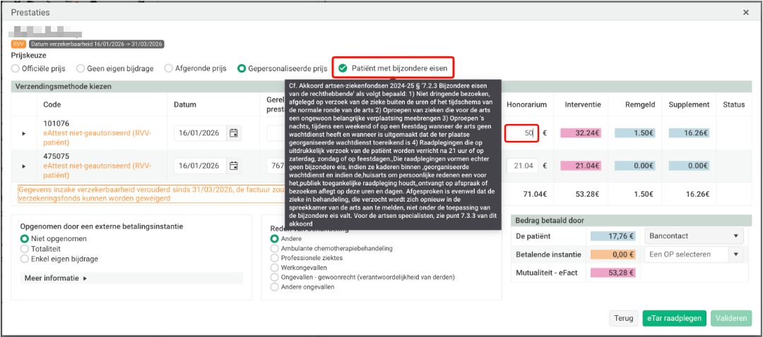 - Via "Patiënt met bijzondere eisen" kan je "Gepersonaliseerde prijs" (en "Afgeronde prijs") terug selecteren, indien aan de voorwaarden voldaan is (cf. tooltip)