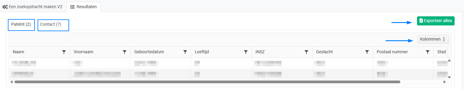 - In het tabblad RESULTATEN vindt u de 2 gewenste resultatentabbladen met resultaten (hier PATIËNTEN en CONTACTEN).