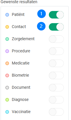 - Op het tabblad EEN ZOEKOPDRACHT MAKEN selecteert u PATIËNT (1) en/of CONTACT (2)